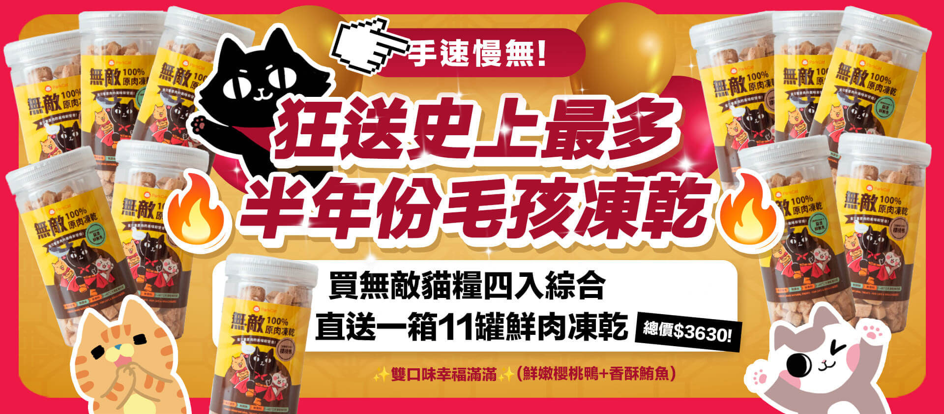 史上送最猛【送半年份鮮肉凍乾】無敵貓糧 四入綜合_六公斤贈品組合包 鮮極魚+火雞鹿+蜂王乳+霸王野雞 送豪華好禮