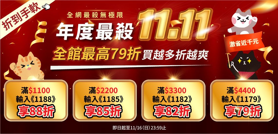 年度最殺雙十一|全館最高79折!!買越多折越爽