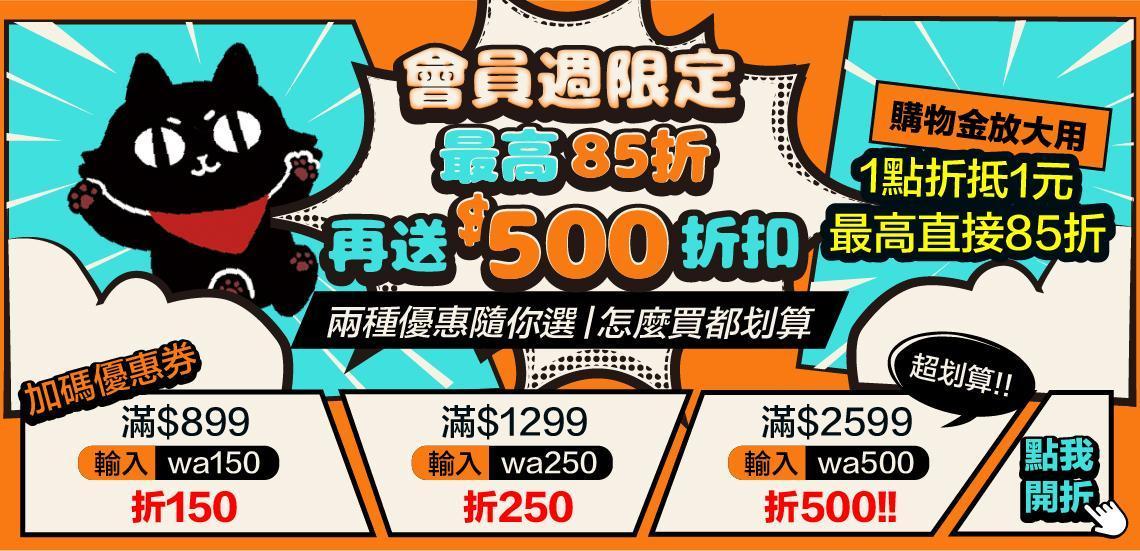 會員周限定 \ 最高85折+送500折扣 / 兩種優惠任你選!