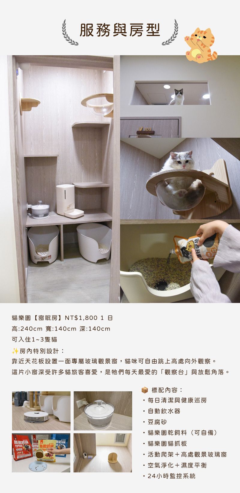 靠近天花板設置一面專屬玻璃觀景窗,貓咪可自由跳上高處向外觀察。
