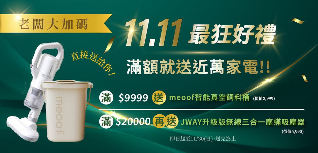 全館消費 單筆滿$9,999 送【meoof真空飼料桶】價值$2999 *送完為止*