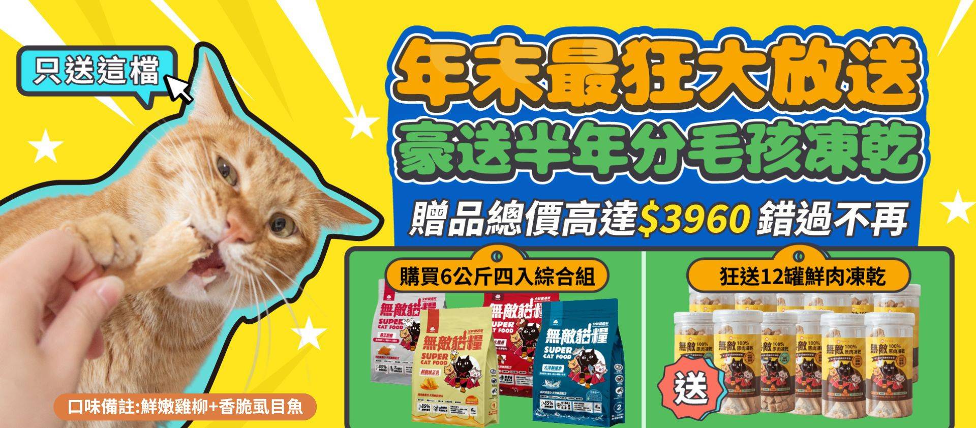 年末最猛大放送【豪送半年份毛孩凍乾】無敵貓糧 四入綜合_六公斤贈品組合包 鮮極魚+火雞鹿+蜂王乳+霸王野雞 送豪華好禮