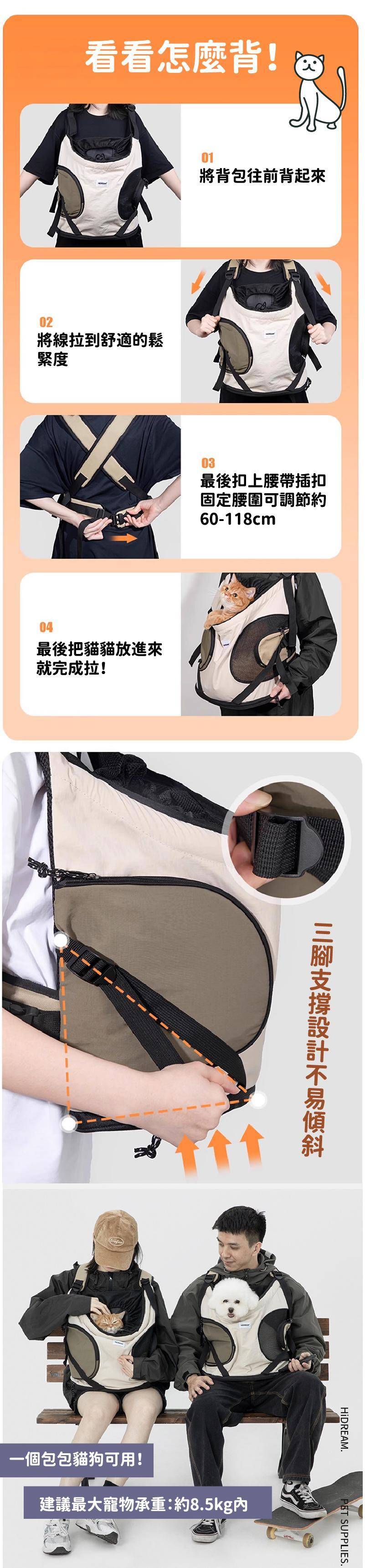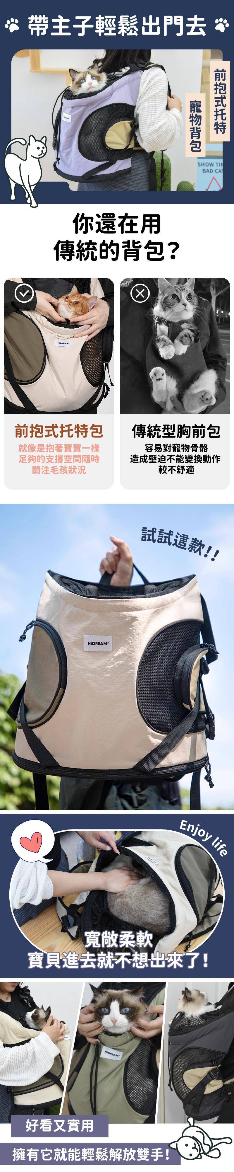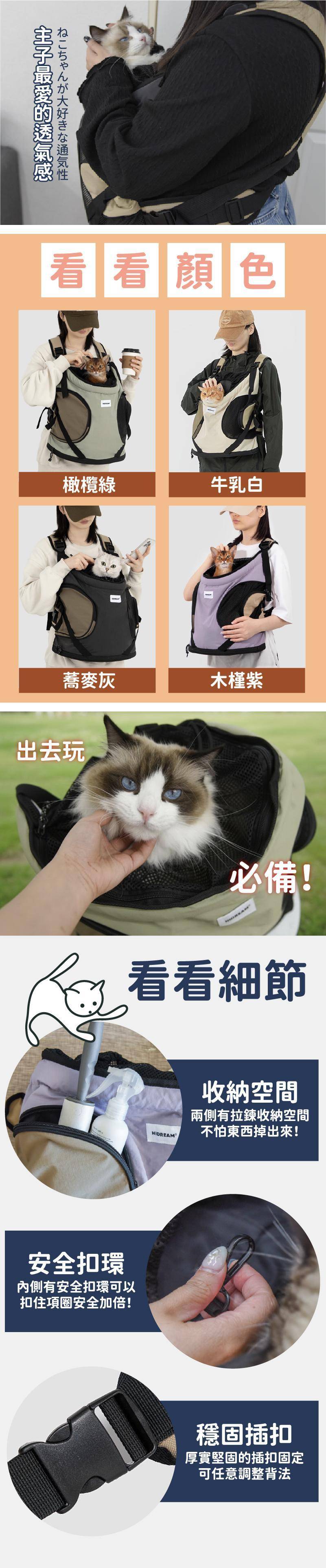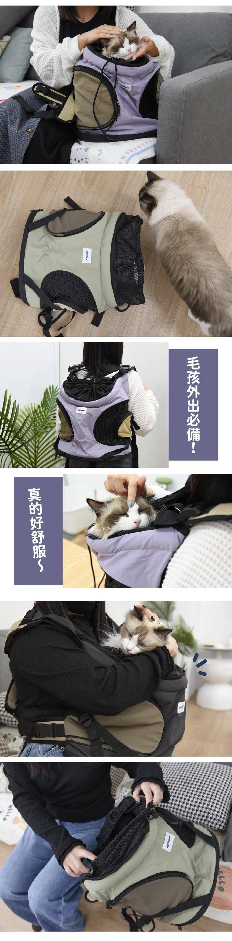 商品詳情 『商品資訊』・商品:【帶主子輕鬆出門去】前抱式托特寵物背包・樣式:牛乳白、木槿紫、橄欖綠、蕎麥灰・尺寸(cm):35*20*36・重量:約742g・材質:尼龍・最大寵物承重:約8.5kg內 【帶主子輕鬆出門去】前抱式托特寵物背包 TWD $1,699 TWD $1,199