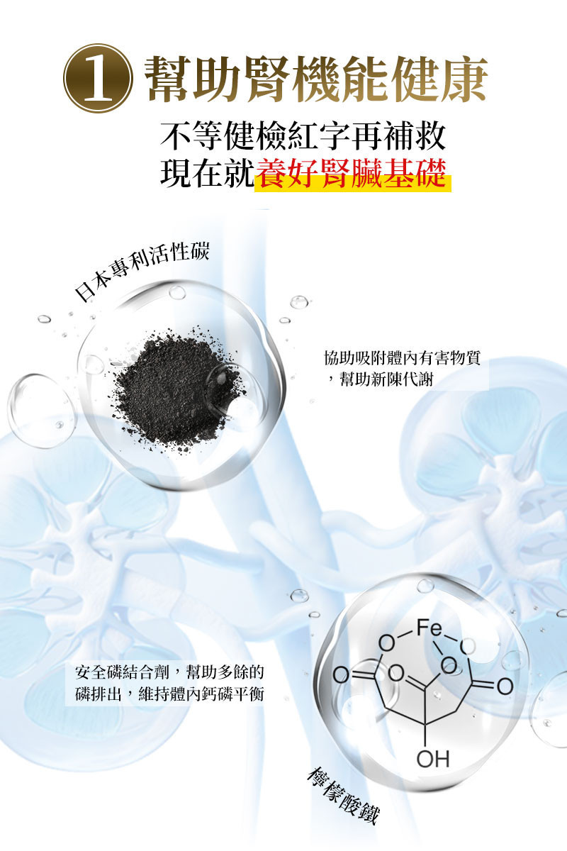 成分:玉米來源可溶性纖維、乳果寡糖、檸檬酸鐵、腎臟複方益生菌(副乾酪乳桿菌Lacticaseibacillus paracasei MFM18、植物乳桿菌Lactiplantibacillus plantarum MFM30-3)、深海魚油粉(含天然Omega-3, DHA及EPA)、活性碳、酵母複合物、菊花萃取物、乳脂粉、輔酶Q10