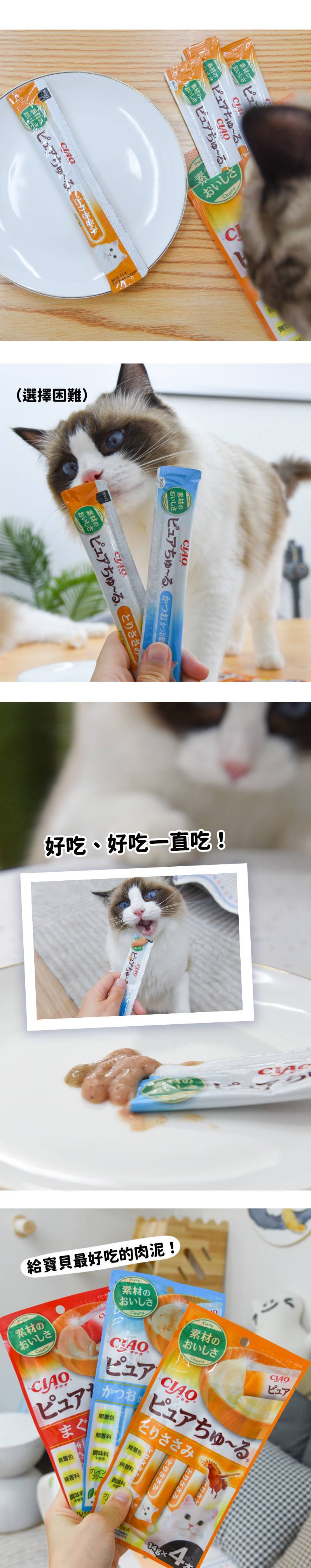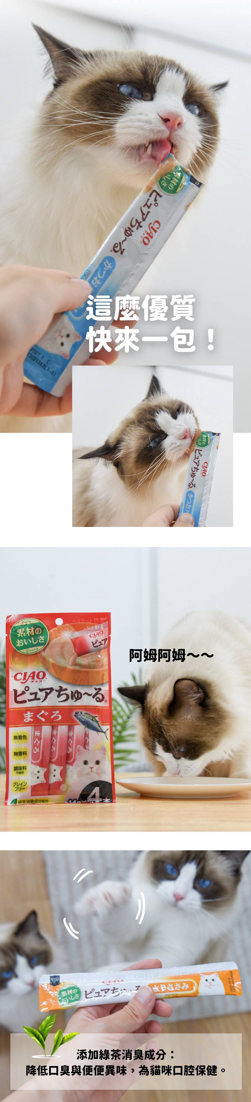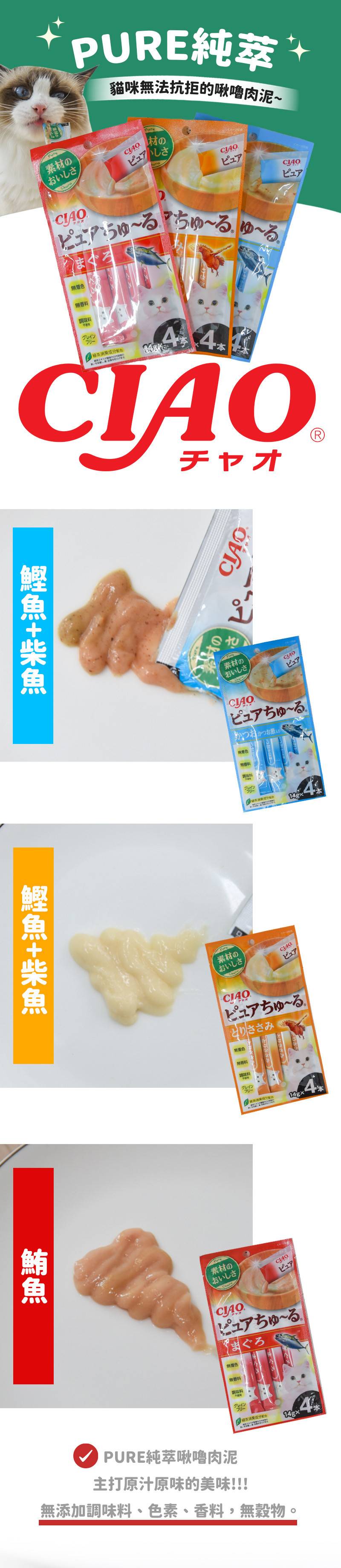 商品詳情 "『商品資訊』・商品:CIAO|PURE純萃啾嚕4入・口味: (鮪魚)、(鰹魚+柴魚)、(雞肉)・規格:14g*4入・產地:泰國・保存:沒開封請放置在乾燥陰涼處,若開封沒食用完請冷藏保存,請盡速食用完畢,以確保食物美味" CIAO|PURE純萃啾嚕4入 TWD $89 TWD$ 49