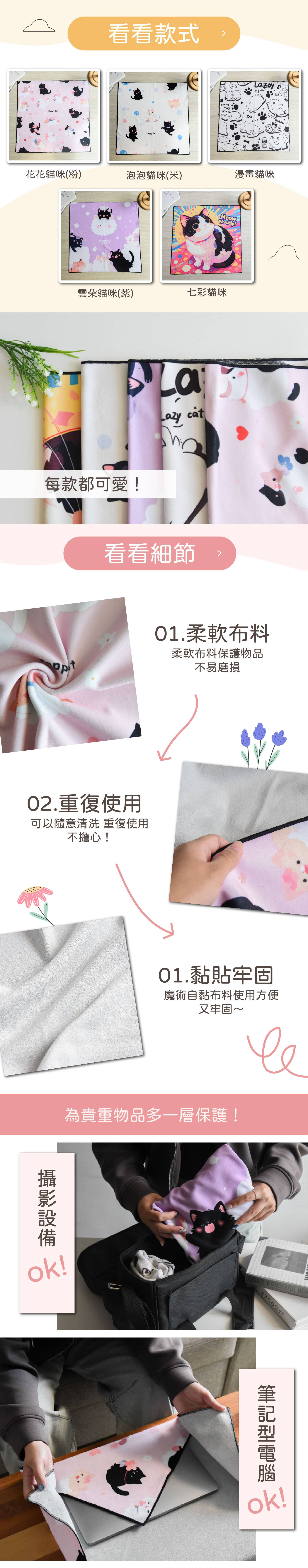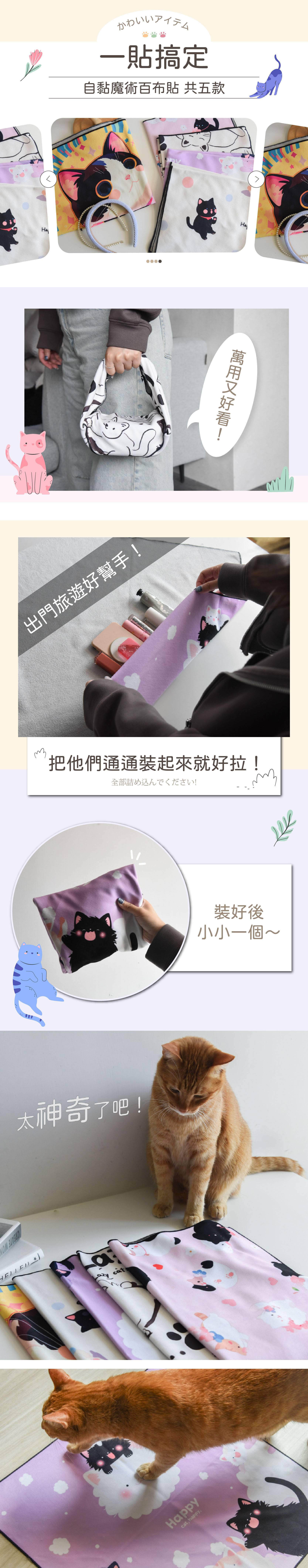 商品詳情 『商品資訊』・商品:【一貼搞定】自黏魔術百布貼 共五款・樣式:花花貓咪(粉)、泡泡貓咪(米)、漫畫貓咪、雲朵貓咪(紫)、七彩貓咪・尺寸(cm):55*55・材質:高分子滌綸 【一貼搞定】自黏魔術百布貼 TWD $259 TWD $179