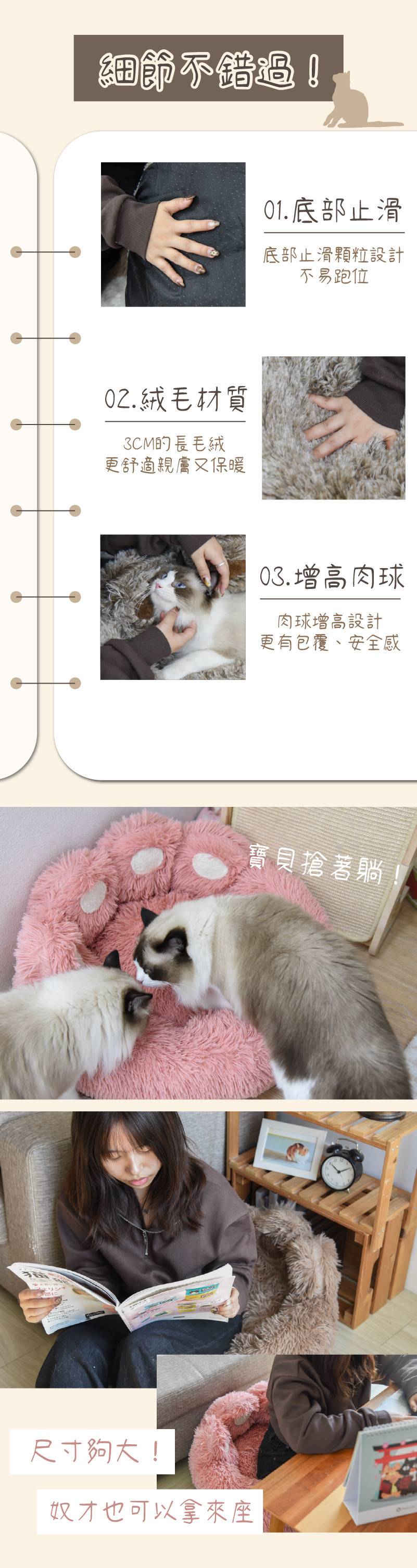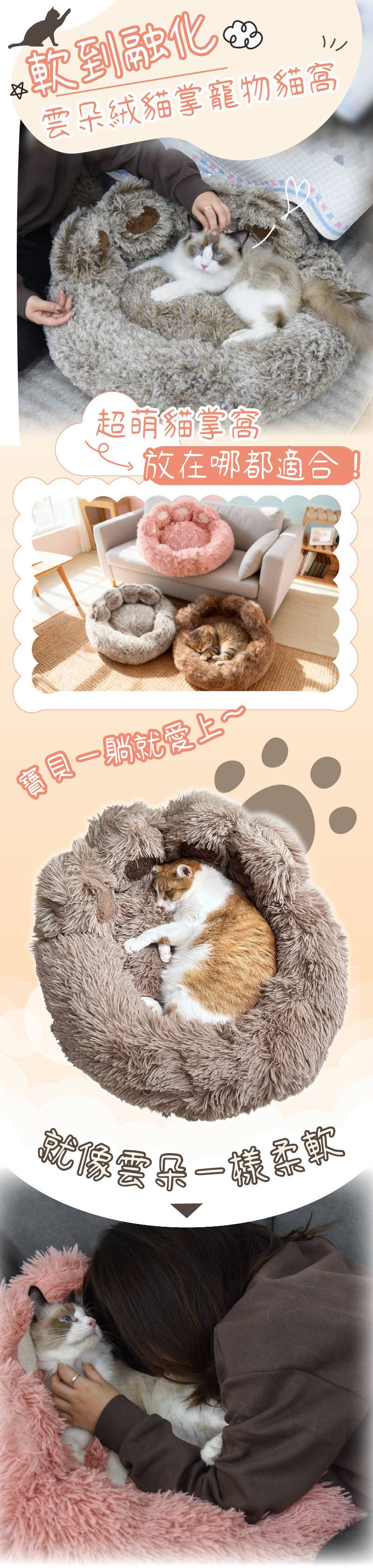 商品詳情 『商品資訊』・商品:【軟到融化】雲朵絨貓掌寵物貓窩・樣式:深咖、灰色、粉色・尺寸(cm):約60*60cm・材質:長毛絨、北極絨・填充:聚脂纖維 【軟到融化】雲朵絨貓掌寵物貓窩 TWD $799 TWD $599