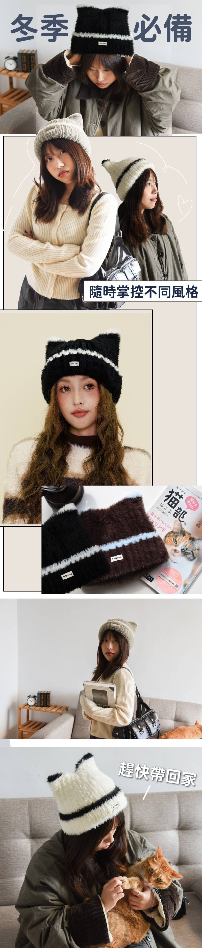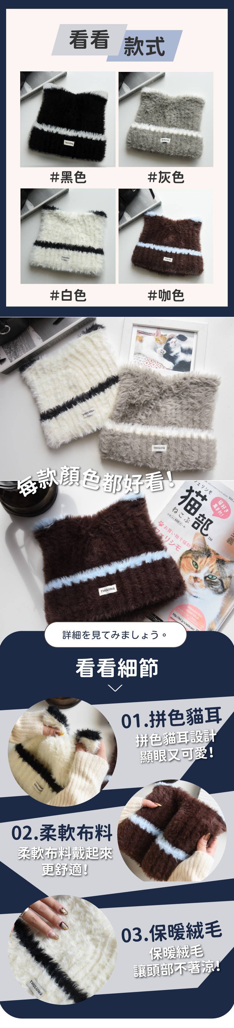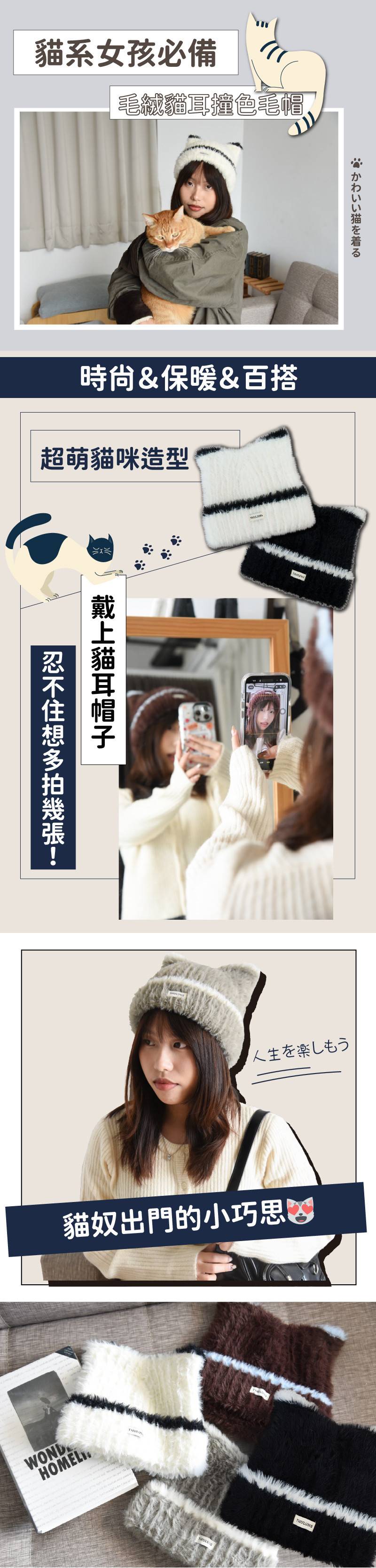 商品詳情 『商品資訊』・商品:【貓系女孩必備】毛絨貓耳撞色毛帽・樣式:黑色、灰色、白色、咖色・尺寸(cm):約22*20cm(均碼)・材質:聚脂纖維・適合頭圍:約55-59cm 【貓系女孩必備】毛絨貓耳撞色毛帽 TWD $399 TWD $279