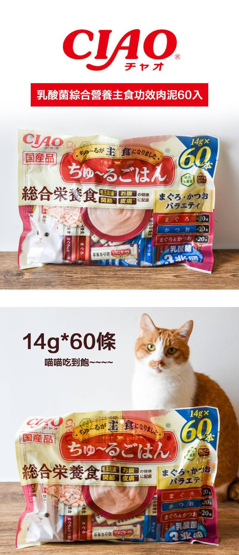 商品詳情 『商品資訊』・商品:CIAO 乳酸菌 綜合營養主食功效肉泥60入・成分: (鮪魚、鰹魚、鮪+鰹)、(鮪魚、雞肉、扇貝)・規格:14g*60條/盒・產地:日本製・保存:沒開封請放置在乾燥陰涼處,若開封沒食用完請冷藏保存,請盡速食用完畢,以確保食物美味
