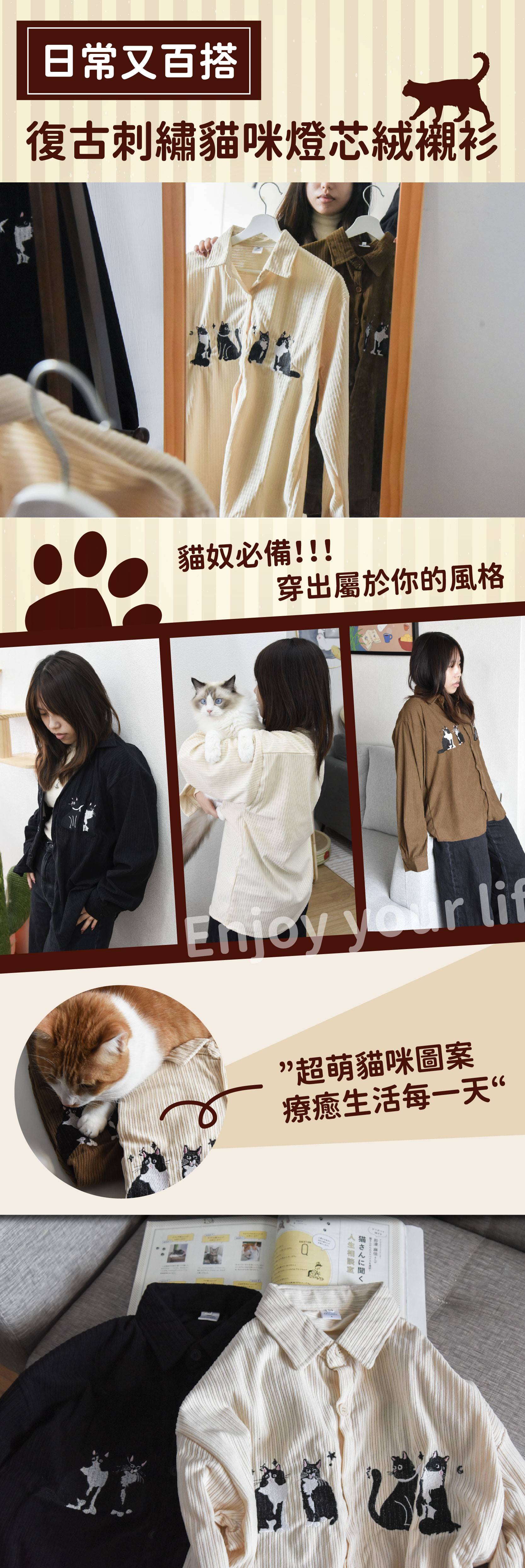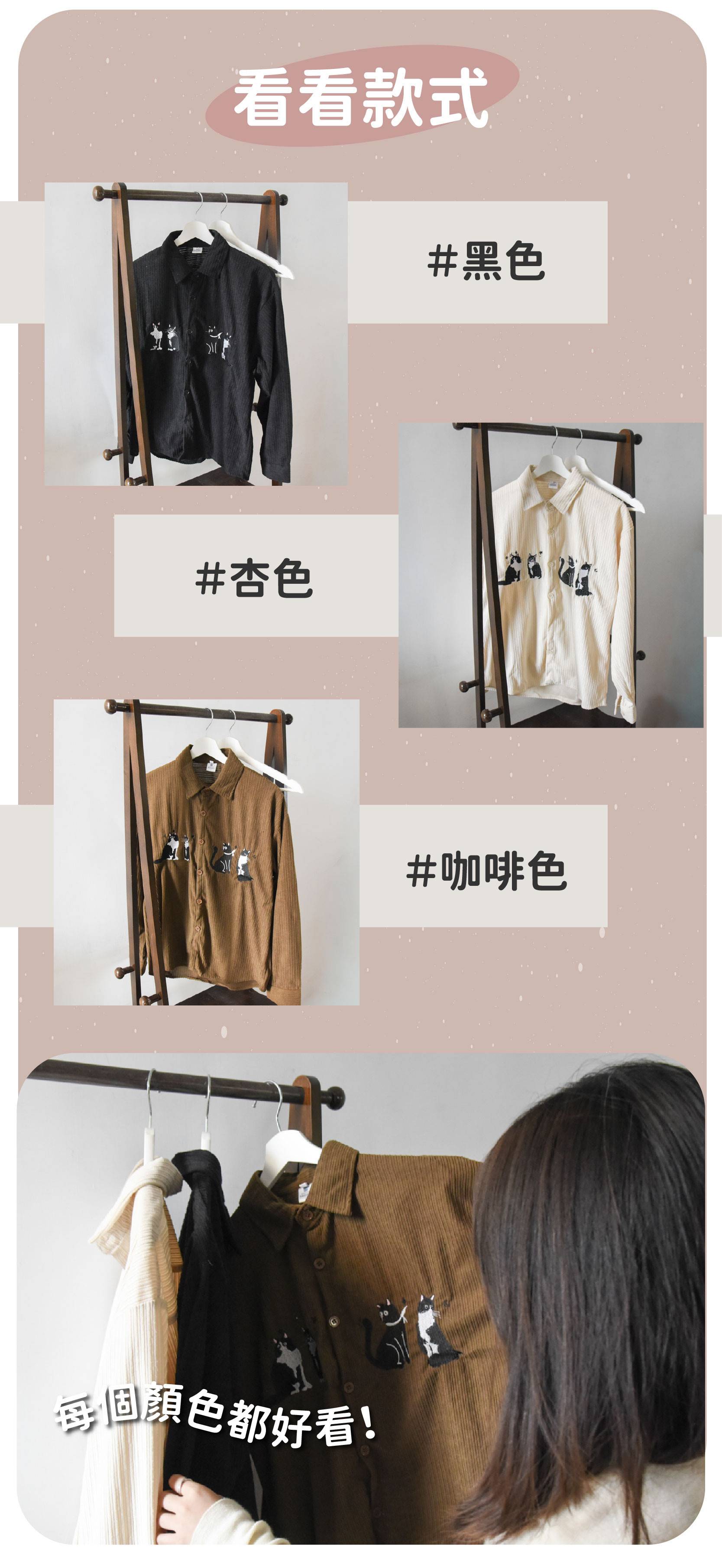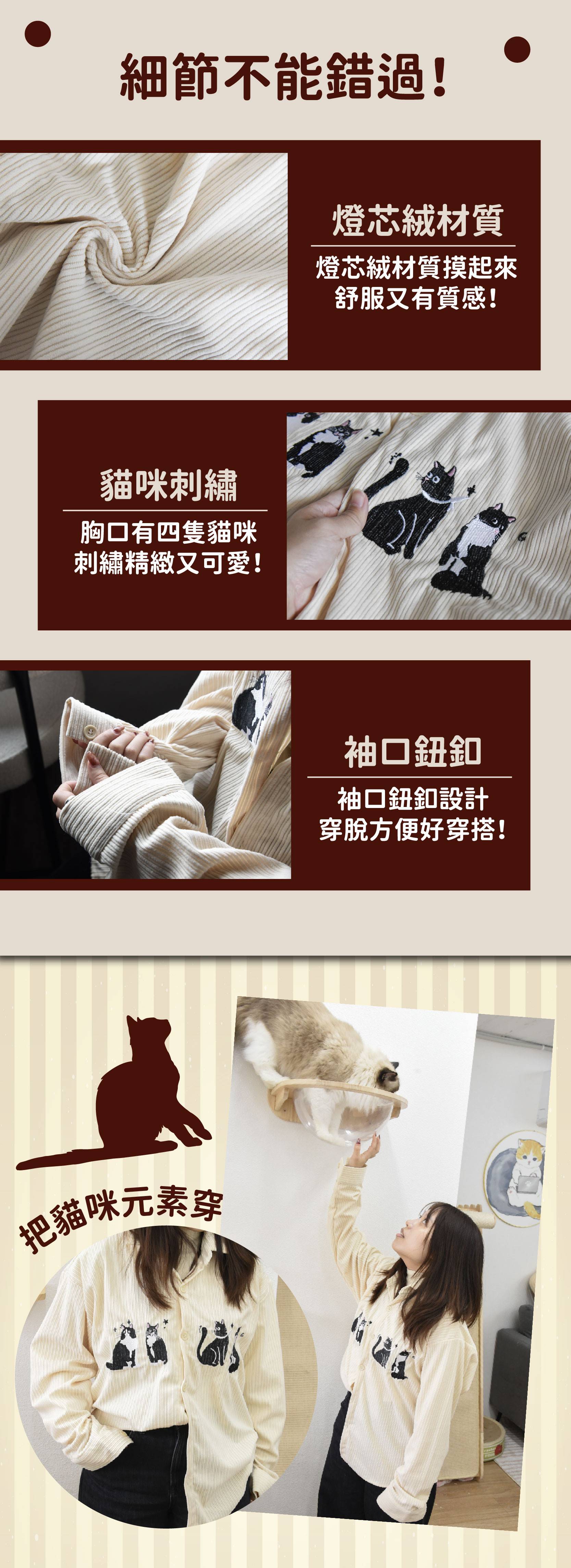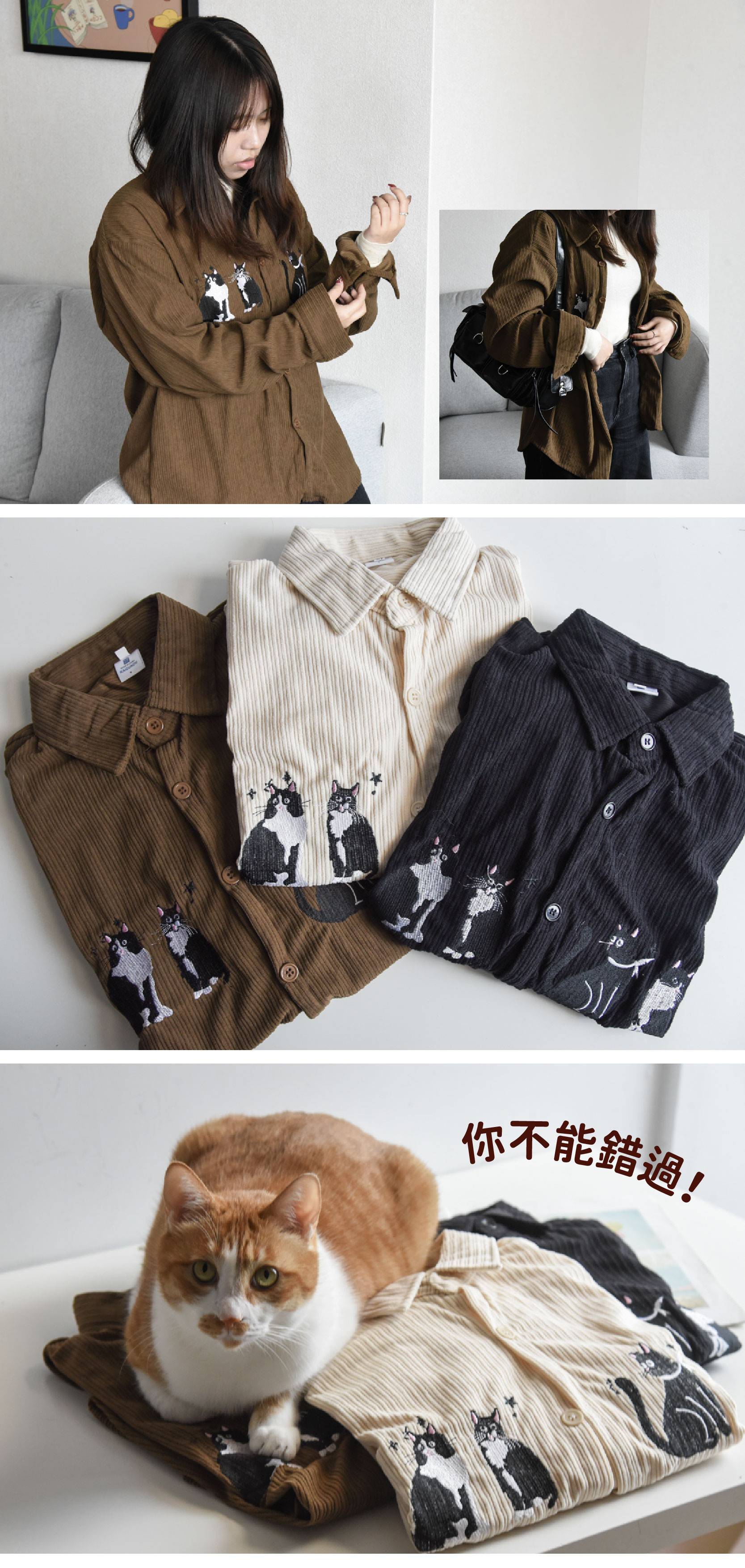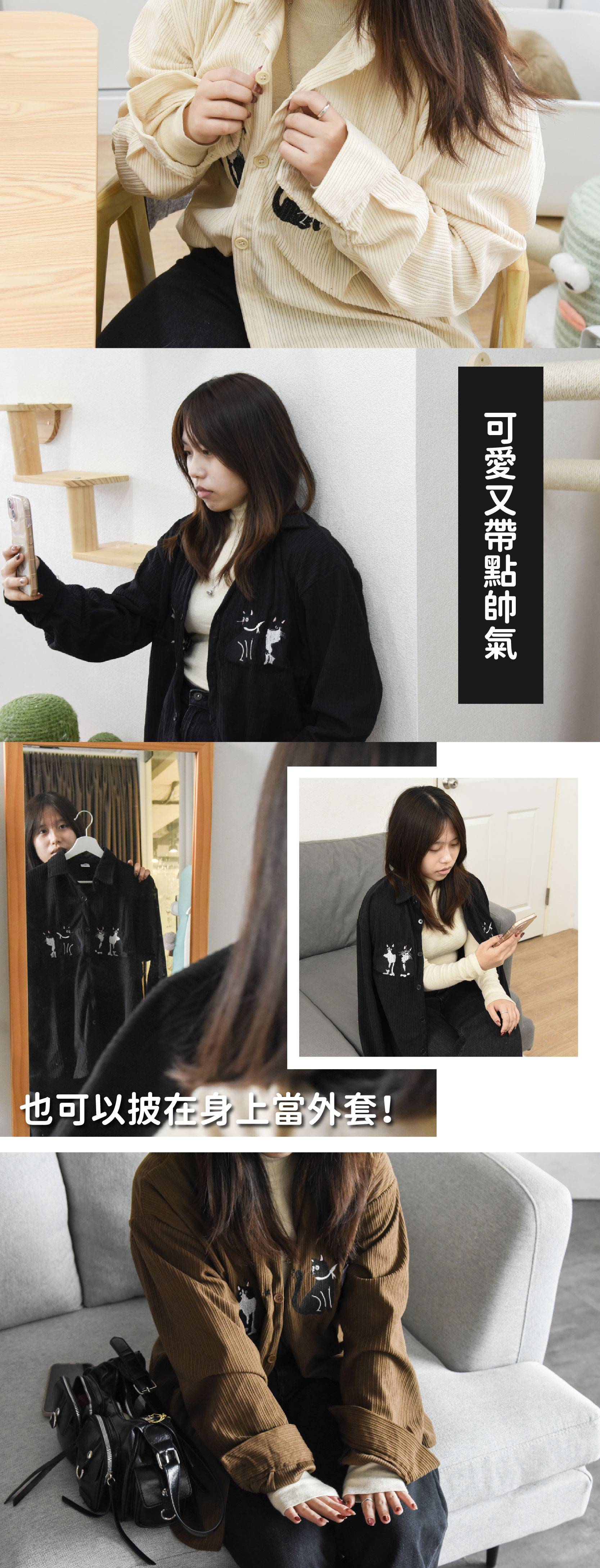 商品詳情 『商品資訊』・商品:【日常又百搭】復古刺繡貓咪燈芯絨襯衫・樣式:黑色、杏色、咖啡色・材質:燈芯絨・尺寸(cm):衣長72 胸圍122 肩寬57 袖長58・備註:尺寸僅供參考,誤差在1-4cm內均屬正常範圍 【日常又百搭】復古刺繡貓咪燈芯絨襯衫 共三色 TWD $699 TWD $599
