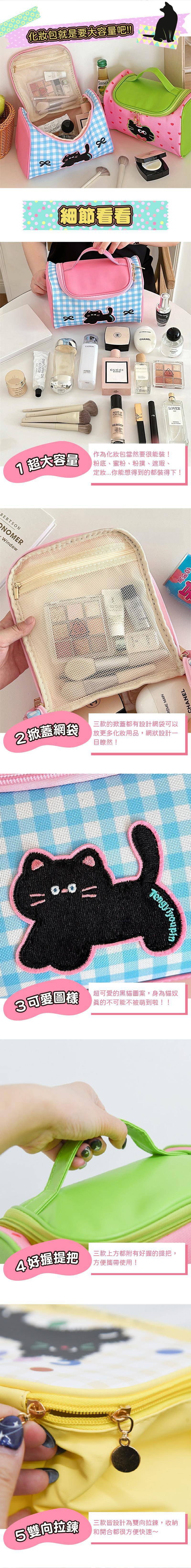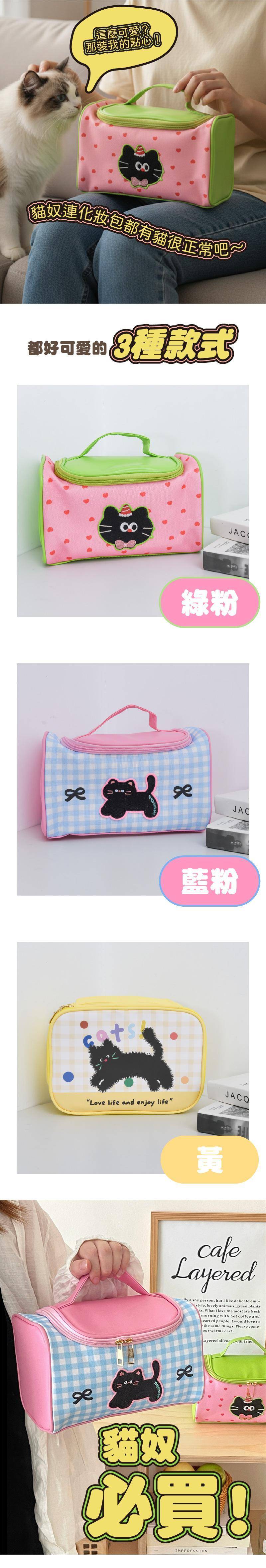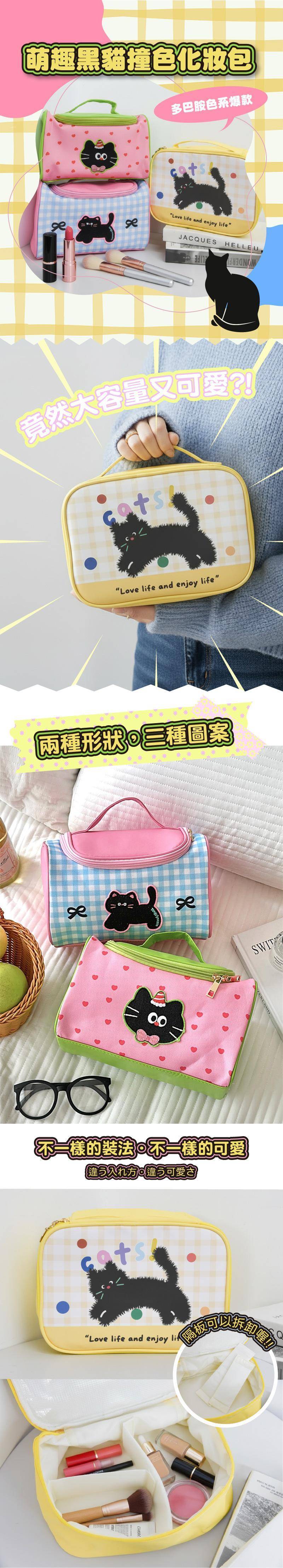 商品詳情 『商品資訊』・商品:【多巴胺色系爆款】萌趣黑貓撞色化妝包・樣式:藍粉、綠粉、黃色・尺寸(單位cm):24.5*16*16.5cm・材質:PU+帆布 【多巴胺色系爆款】萌趣黑貓撞色化妝包 TWD $399 TWD $269