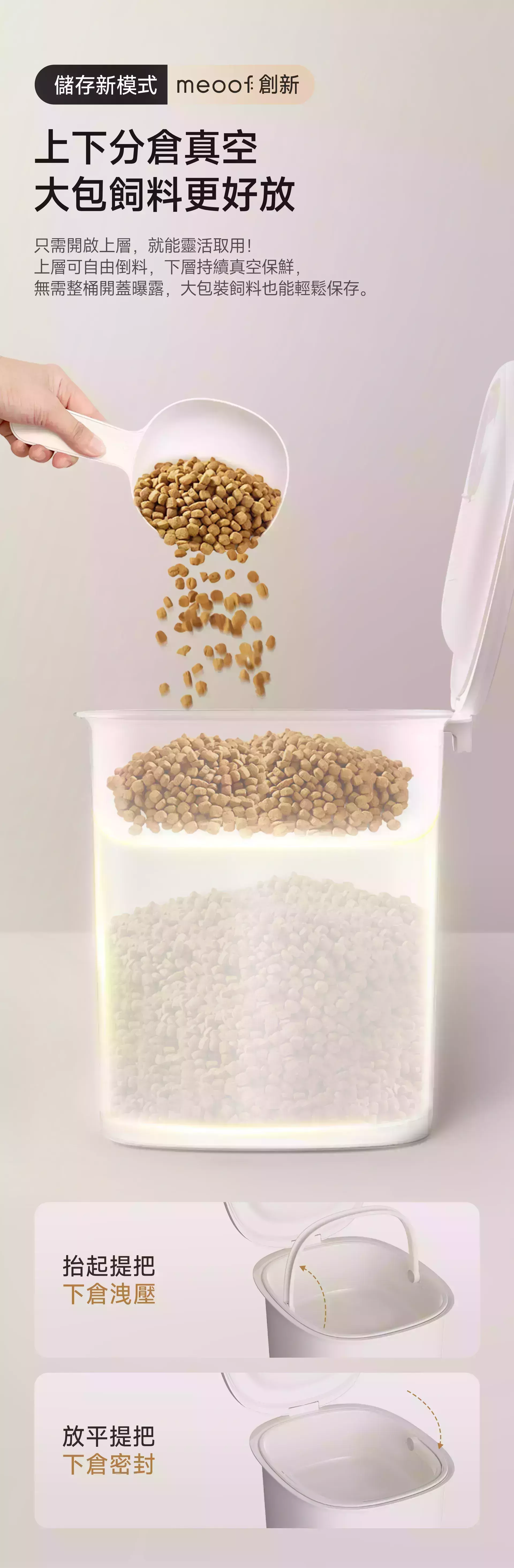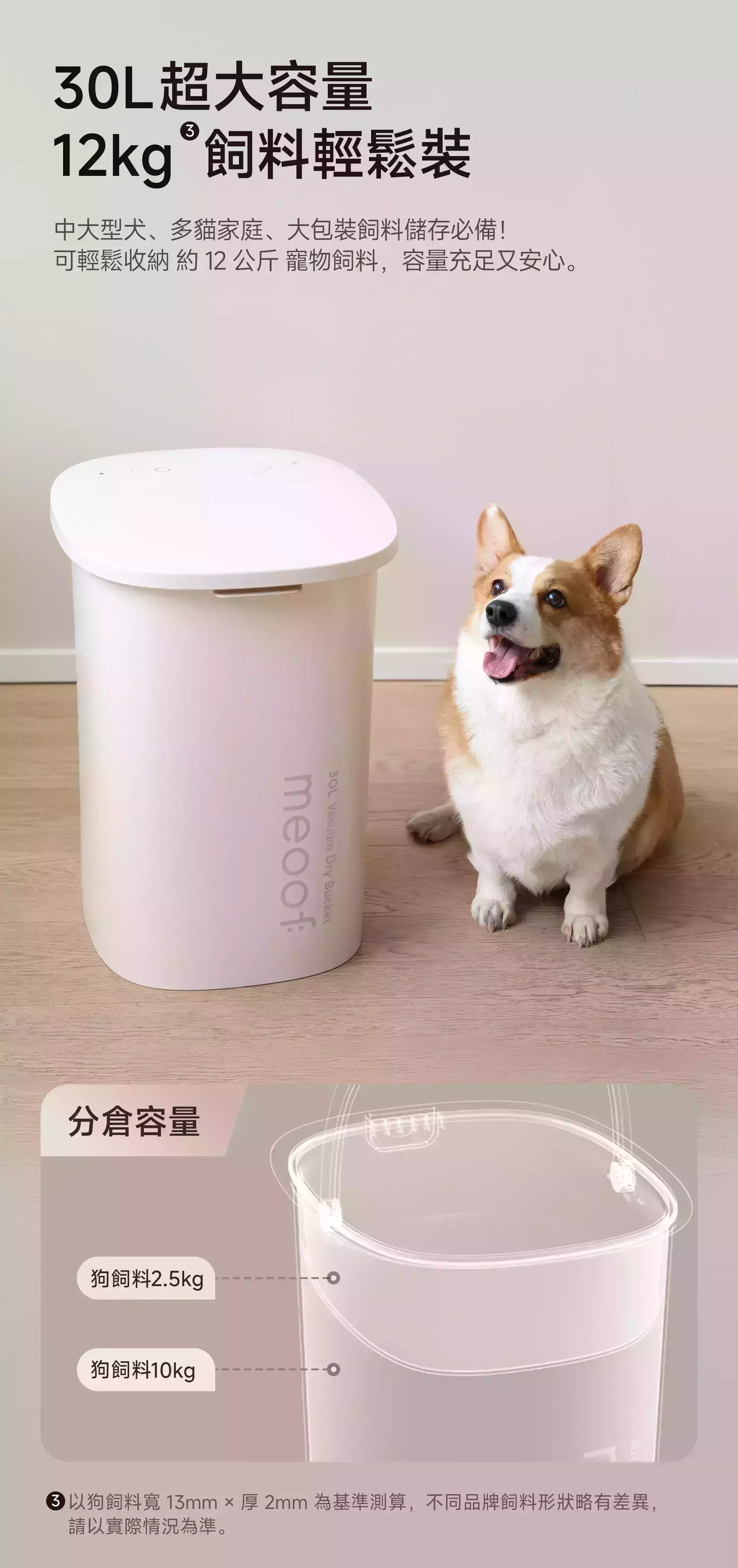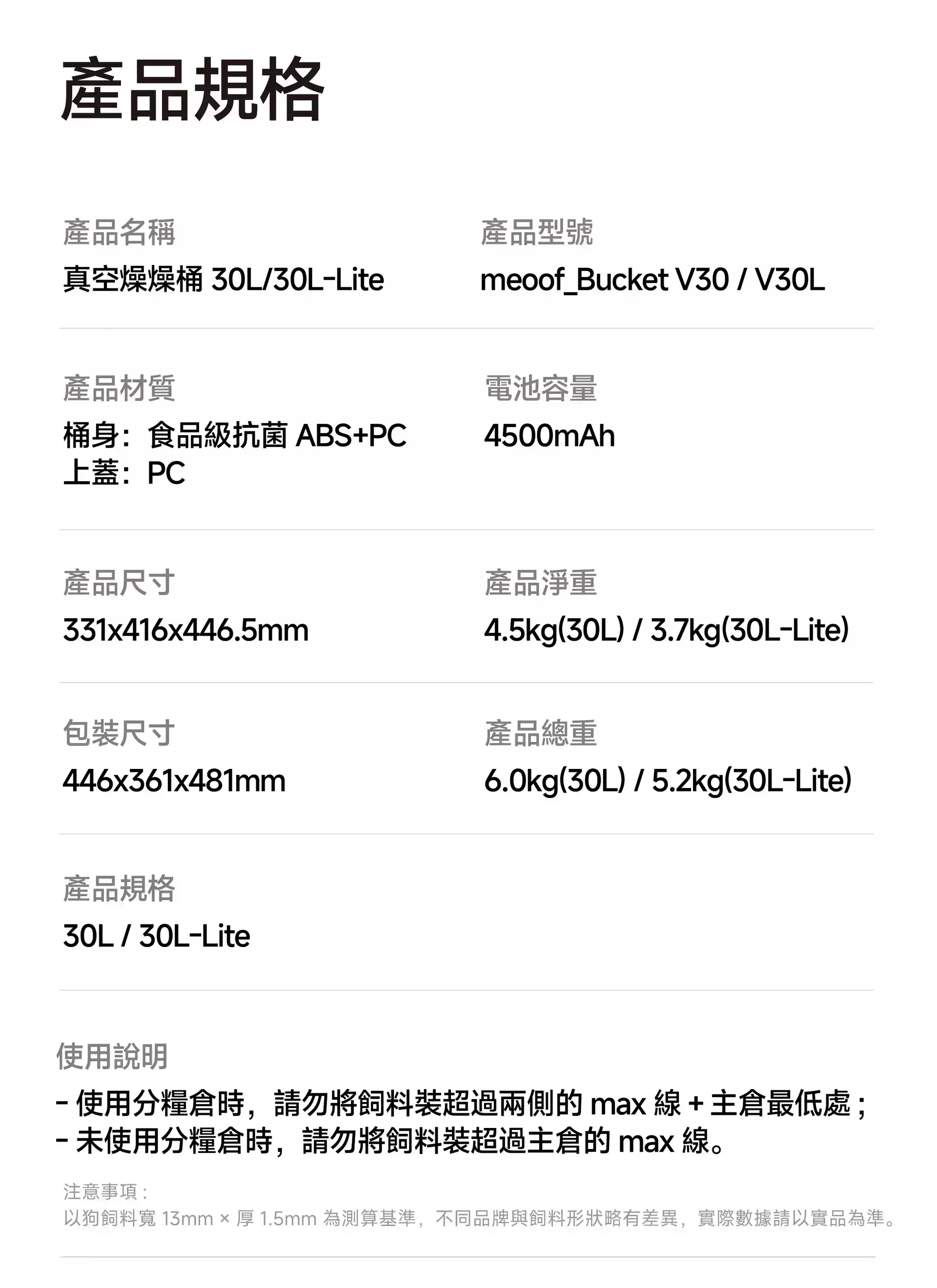 商品詳情 『商品資訊』・商品:【真空+除濕新升級】meoof真空燥燥桶30L・材質:桶身/食品級抗菌ABS+PC、上蓋/PC・容量:30L・重量:約4.5kg(30L)・尺寸:33.1*41.6*44.65(cm)・電池容量:4500mAh・備註:使用分糧倉時,請勿將飼料裝超過兩側的max線+主倉最低處;未使用分糧倉時,請勿將飼料裝超過主倉的max線・注意事項:上蓋及電池不可水洗 【真空+除濕新升級】meoof真空燥燥桶 除濕盒 TWD $140 TWD $140