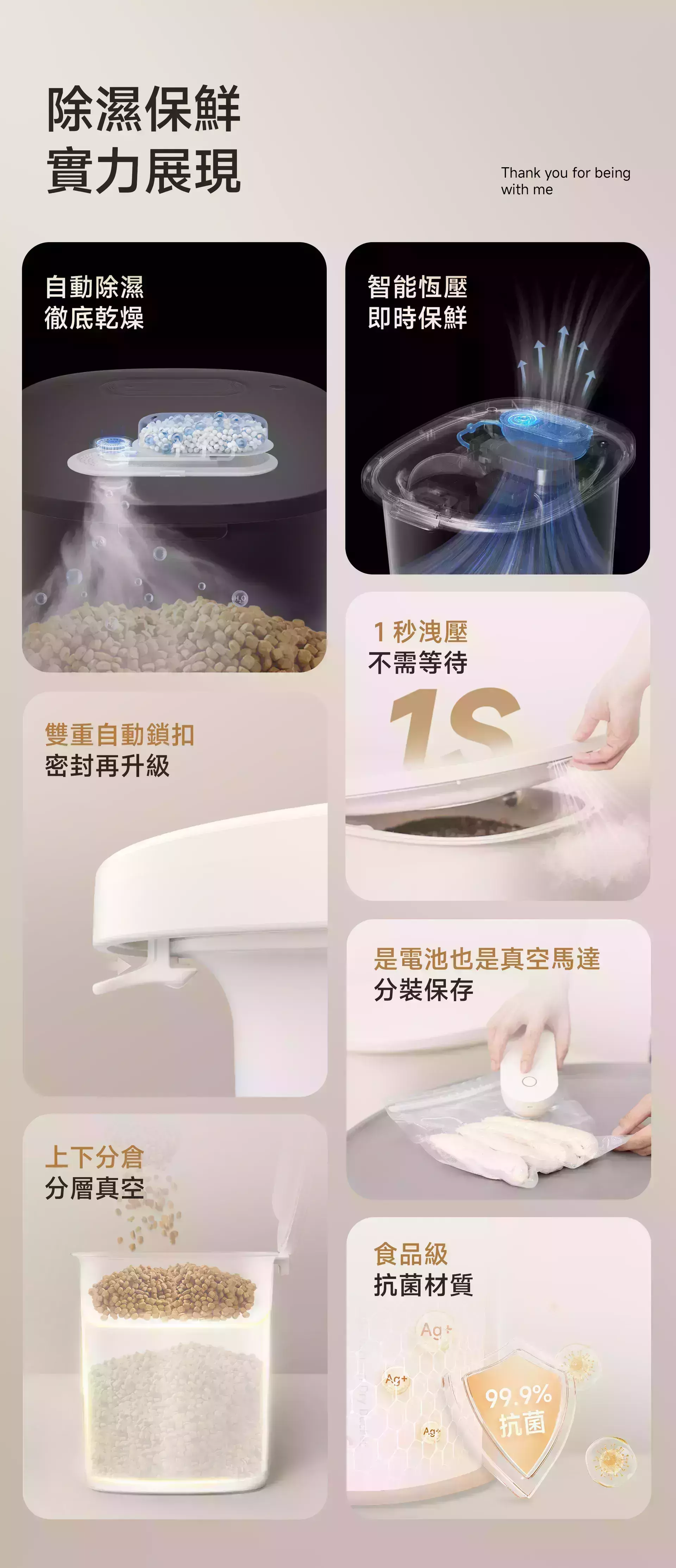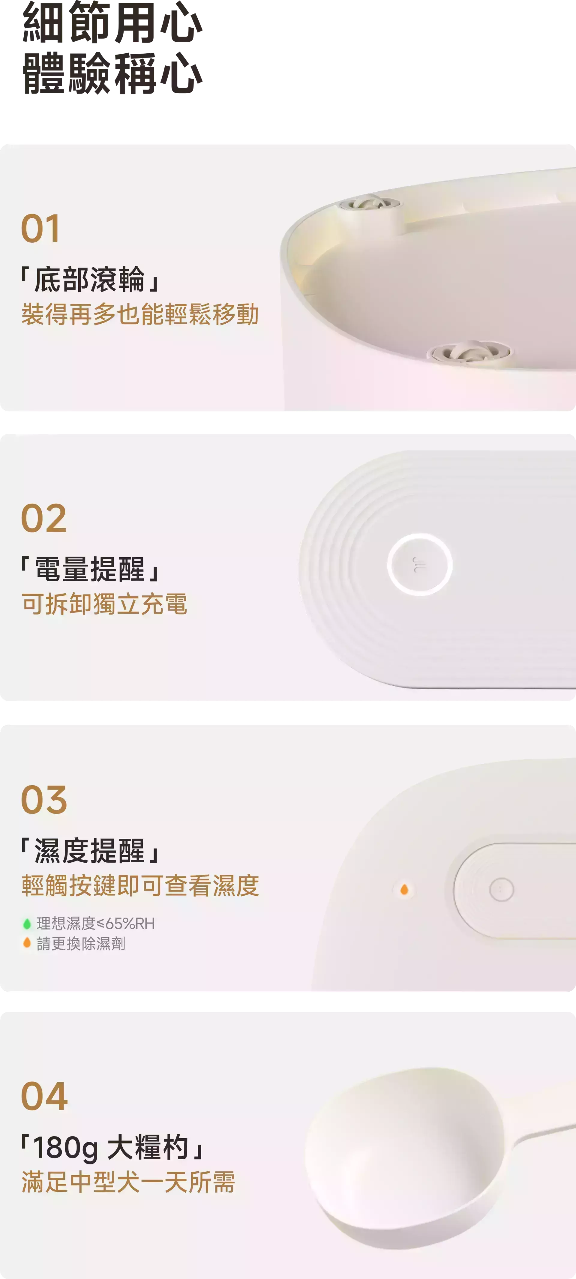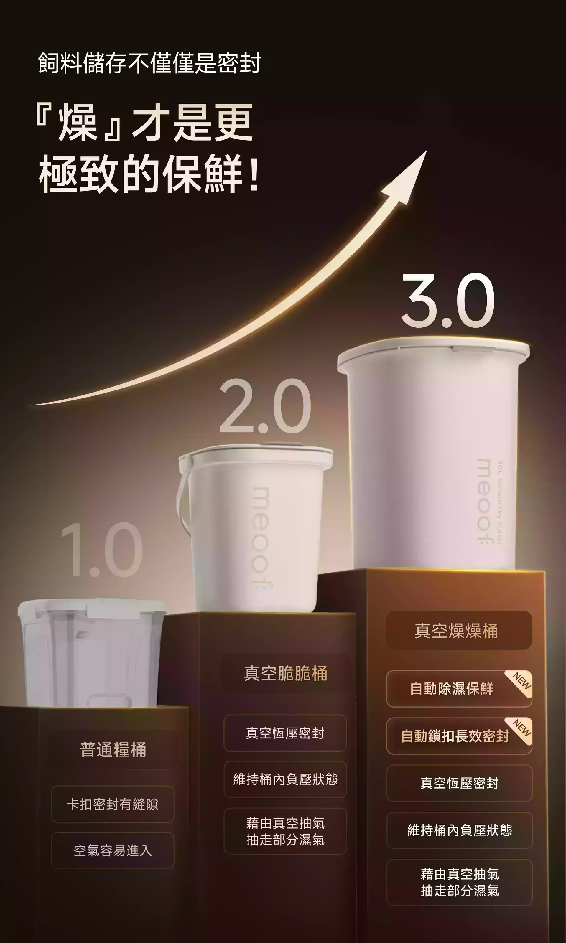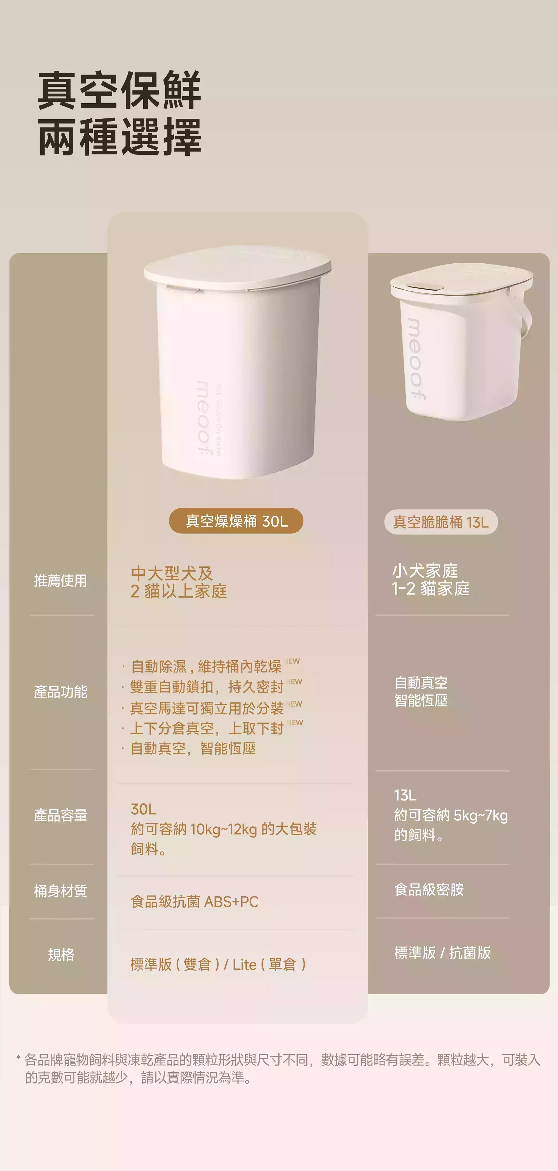 商品詳情 『商品資訊』・商品:【真空+除濕新升級】meoof真空燥燥桶30L・材質:桶身/食品級抗菌ABS+PC、上蓋/PC・容量:30L・重量:約4.5kg(30L)・尺寸:33.1*41.6*44.65(cm)・電池容量:4500mAh・備註:使用分糧倉時,請勿將飼料裝超過兩側的max線+主倉最低處;未使用分糧倉時,請勿將飼料裝超過主倉的max線・注意事項:上蓋及電池不可水洗 【真空+除濕新升級】meoof真空燥燥桶 除濕盒 TWD $140 TWD $140